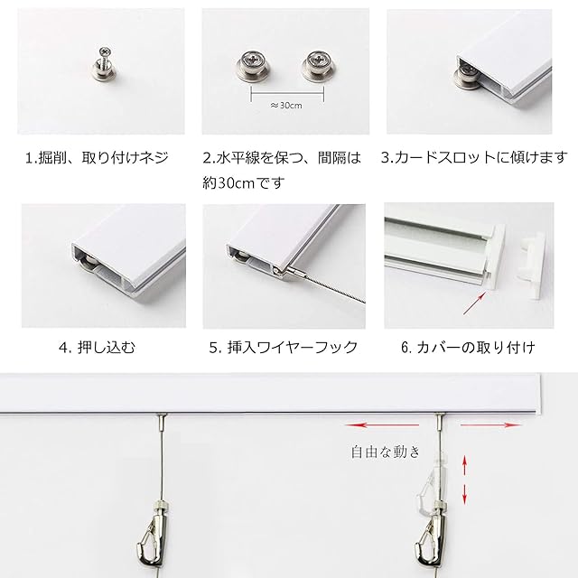 <b>ピクチャーレール長さ:</b>2m。<br><b>付属品:</b>ピクチャーレール本体1m2本、ピクチャーレールワイヤー1m4本、カバー4個、丸い留め具7個、コンクリート壁用ネジ7個、拡張パイプ(コンクリート壁用)7個、石膏ボード壁用ネジ7個、拡張パイプ(石膏ボード壁用)7個、日本語取扱説明書1本。<br><b>高さ調節:</b>ワイヤーフック形状の自在金具の ピンを押し込むだけで無段階で作品のお好きな位置に 調節ができてしまいます。<br><br>設置は安全性に十分配慮して行ってください。設置後は軽く引っ張るなど、安全性を確認してください。<br><b>注:壁面用。</b><br><b>品質:</b>商品の品質には万全を期しておりますが、万一不良品、破損、誤納品などがございましたら、メールにてご連絡くださいませ。お客様が満足できるよう、誠心誠意対応させていただきます。