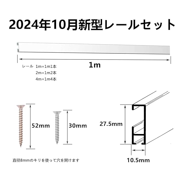 ★【付属品】:ピクチャーレール本体1m*2本、ピクチャーレールワイヤー1m*4本、カバー4個、丸い留め具7個、コンクリート壁用ネジ7個、拡張パイプ(コンクリート壁用)7個、石膏ボード壁用ネジ7個、拡張パイプ(石膏ボード壁用)7個、日本語取扱説明書1本。製品重量0.9kg。