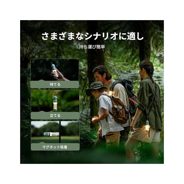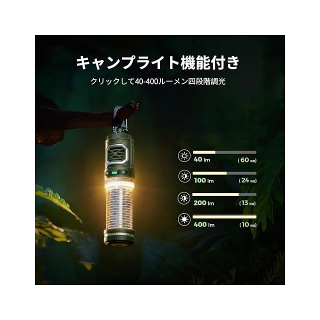 【キャンプ用ランタン機能】 キャンプ用ランタンとして、TINY REPELLER S は 50Lm、200Lm、400Lm の 3 つの明るさレベルを提供し、薄暗い場所から明るい場所まで照明のニーズを満たします。呼吸ライトモードを備えており、柔らかく徐々に変化する光を提供し、穏やかな雰囲気を作り出し、リラックスするのに役立ちます。