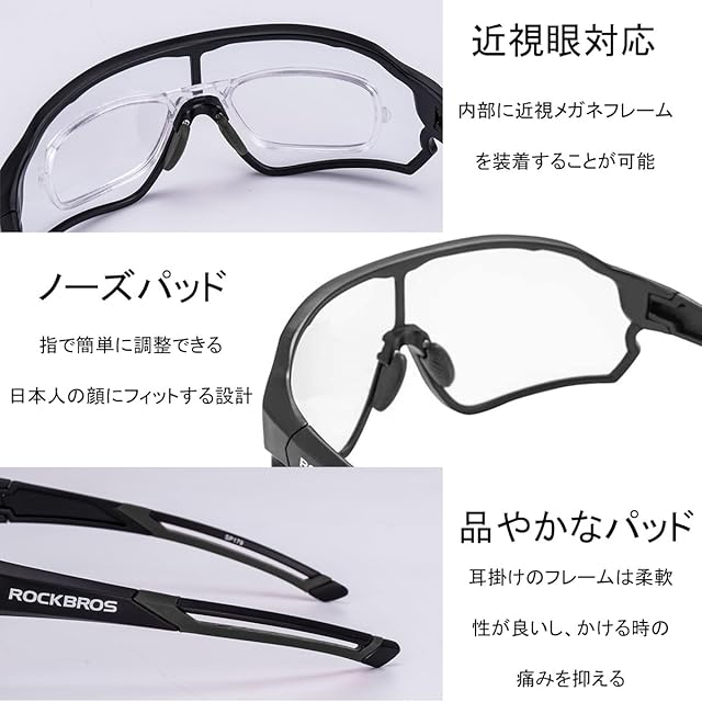 【快適なデザイン】①インナーフレームが付属:お近くのメガネショップで度付きレンズを装着できます。②ノーズが調節可能:鼻あて部分は高品質なシリコンで作られ、滑りにくく鼻にフィットし、快適で安定した付け心地を保ちサイクルサングラスです。③通風口設計:スポーツサングラスのフレームに通風口があり、運動中の風の抵抗力を減軽します。