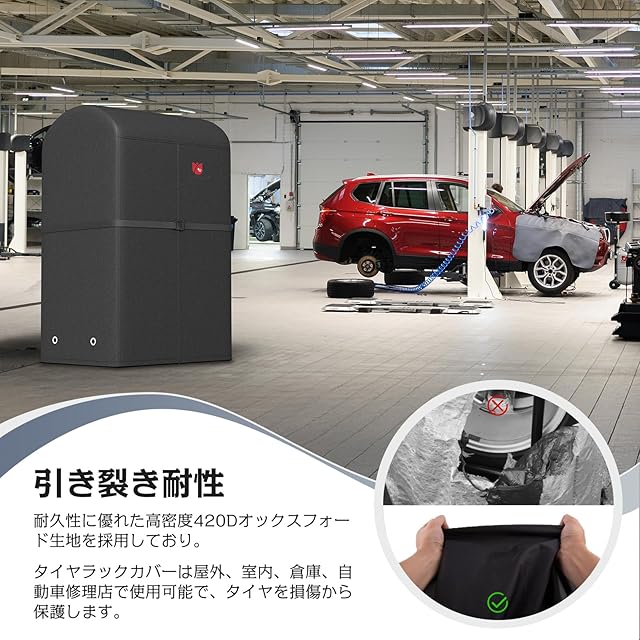 【品質の生地&優れた防水性能】: 高品質のオックスフォード生地を採用し、超強力な防水性能を備えており、水圧3000mmに耐えることができます。背面の防水テープで補強しており、暴風雨で水漏れすることはありません。タイヤラックカバーは屋外、室内、倉庫、自動車修理店で使用可能で、タイヤを損傷から保護します。