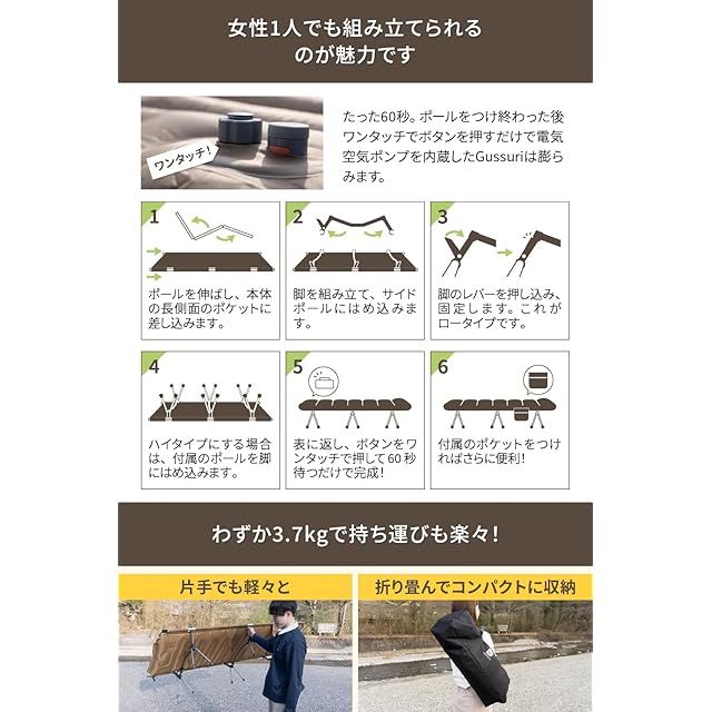 ✅【ワンタッチ60秒で自動膨張】女性でも簡単に組み立てられるように60秒ワンタッチで膨らむエアーマット式にしました。ボタンをただ1つ押すだけなので面倒な空気入れ作業とはおさらばできます。