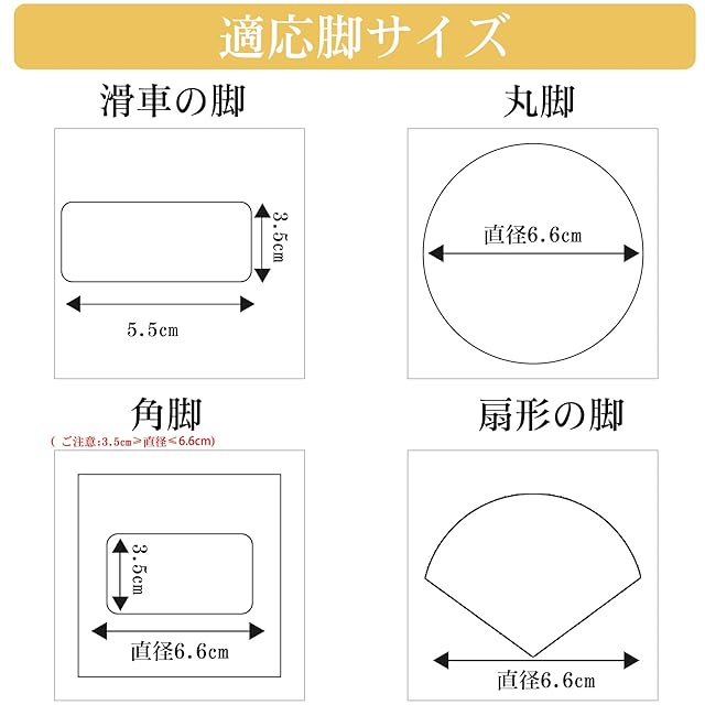 【注意事項】大型家具の脚が本品に納まる範囲かどうか、事前にご確認の上、お買い求めください。必ず4個セットでご使用ください。万一、1個でも破損した場合は直ちに使用を中止してください。