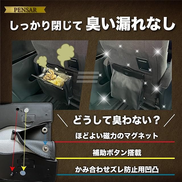 ✅【簡単取り付け】 本体の設置はシートのバックポケットへで引っ掛けるだけでOK。 磁石搭載で袋の開け閉めも片手で楽々。 ゴミ袋の取付も内側の爪に挟むだけの単純構造。