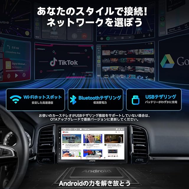 商品名:ATOTOZONE A5L Android ディスプレイオーディオ2DIN、ンドロイドナビ7インチ プレーヤー・レシーバー、ワイヤレスCarPlay/Android Auto対応、Wi-Fi/Bluetooth/USB テザリング、GPS追跡、ChatGPT-AI、24段EQ DSP、2G+32G、FM/AM、USBオーディオ&ビデオ、バックカメラ付属