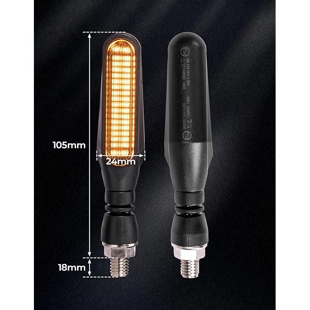 【車検対応】透明レンズ表面印刷には内部光の屈折や輝度への影響がありますので、KEMIMOTOのバイク ウインカーの背面のABS素材の表面にE-mark処理を施しており、このようにして、LEDチップの高輝度効果を100%達成しました。国際的なEマーク認証を取得し、車検対応しています。