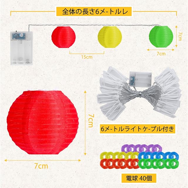 商品名:提灯ライト LED 6M 40球 防水 ちょうちんライト ストリングライト電池式 屋内屋外 祭り装飾 お盆飾り キャンプ 庭 ベランダ パーティー イベント用(レインボー, 6M 40球)