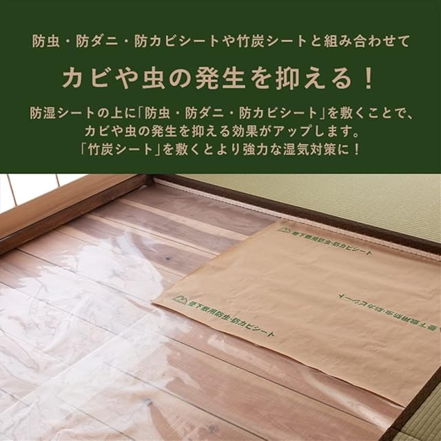 ※こちらの防湿シートには、除湿効果はありません。湿気を防ぐ防湿効果のみとなります。湿気が気になる場合は竹炭シートと、カビやダニが気になる場合は防虫・防ダニ・防カビシートと組み合わせてお使いください。