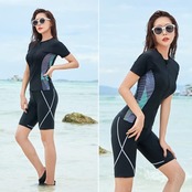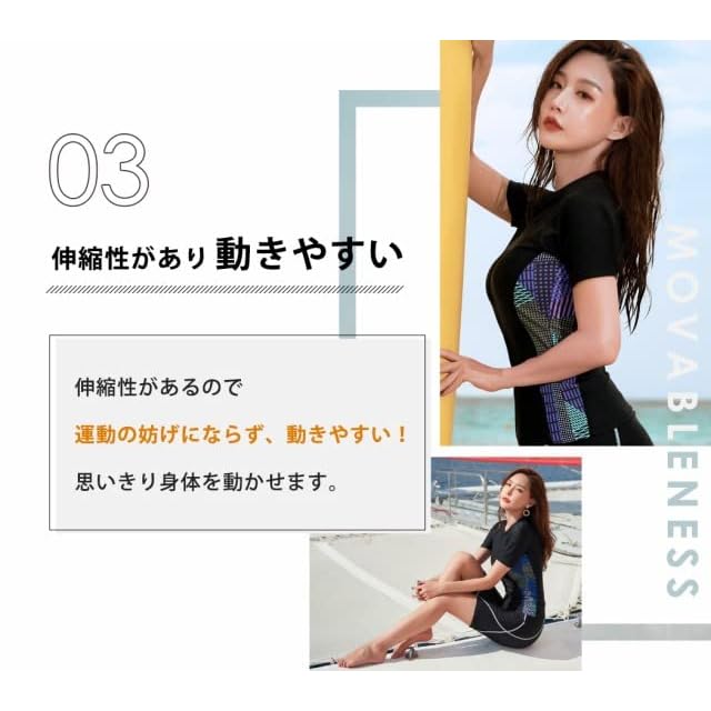 レディース 水着 3点セット<br> フロントジップトップス ハーフパンツ フィットネス水着<br> シンプルで着こなしやすいスイムウェア<br> 伸縮性/紫外線対策/海/川遊び/プール<br> SIZE S/M/L/LL/3L/4L/5L<br> 海や川、プールでのレジャーでは勿論<br> ジムでのアクアフィットネス<br> 水中ウォーキングにもおすすめ!<br> SEA/RIVER/POOL/GYM<br> Can be used in various scenes<br> 01<br> 気になる体型をカバー<br> ブラック×スポーティな印象の<br> サイドラインで細見え効果も◎<br> 身体のラインを強調しすぎず程良くカバーします。<br> 02<br> 肩の負担がかかりにくい<br> セパレートデザイン<br> ワンピース水着では肩に負担が<br> かかりやすい方もセパレートだと<br> 肩に負担がかかりにくいのでオススメです。<br> 着脱しやすく着替えやすいのも<br> セパレートの嬉しいポイント!<br> 03<br> 伸縮性があり動きやすい<br> 伸縮性があるので運動の妨げにならず、動きやすい!<br> 思いきり身体を動かせます。<br> 04<br> 紫外線対策にも◎<br> 肩回り~膝上までカバーができて<br> ビキニ跡が残らないので<br> 日差しを浴びるアウトドアにもオススメ!<br> パッド有無○ <br> パッドポケット○ <br> ワイヤー× <br> 肩ひも取り外し× <br> 肩ひも調節× <br> アンダー調節× <br><br>対象年代:20代 30代 40代 50代 60代