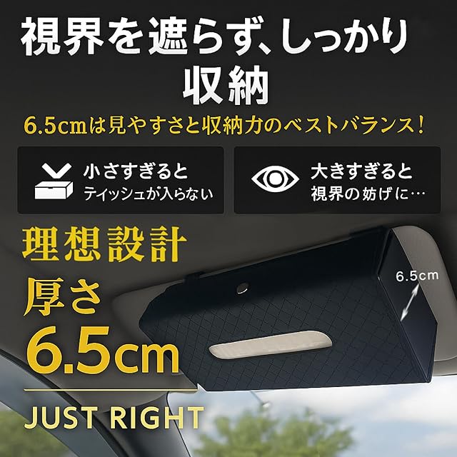 従来品をご購入いただいた方へのアンケートを参考に、様々な方の貴重なご意見から改良を重ね完成した当社オリジナルの車用ティッシュケースです。 国内の有名メーカーのスリムタイプのBOXティッシュが箱ごとそのまま入ります。 【改良点・従来品との違い】 1.ティッシュケースの厚みを8.5cmから7.0cmにしました。 2.クリップとの間隔を広くしました。 3.重さを320gから280gに改良。 商品サイズ:25.0cm×13.0cm×6.5cm 重量280g Blissh 商願2022-071543