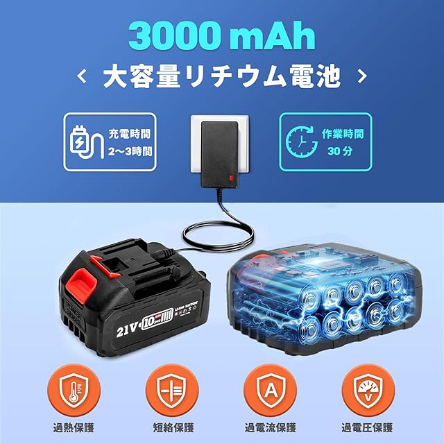 【LED電池残量表示】省電力、干渉のない設計を採用し、残量確認ボタンを押したときだけ、4段階の残量表示ライトが点灯します。バッテリーはどのくらい容量があるか一見だけで分かって安心します。モデルのバッテリーは3.0Ahの大容量で、電動工具が長時間連続稼働できます。充電時間は約3-4時間が、作業時間は約30分です。電動工具によって、作業のスピードとパワーが違っていますので、実際の作業時間によっては誤差があります。注意:充電前にコネクタに異物がないか確認して、接触不良を回避してください。