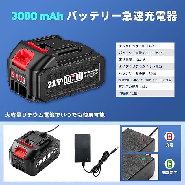 マキタ 互換 バッテリー BL2160B BL2120b BL2130b BL2140b BL2150b 21V 3.0Ah 大容量 長時間作業可能 バッテリー 充電器セットマキタ電動工具用バッテリー LED電池残量表示 複数の保護措置 軽量