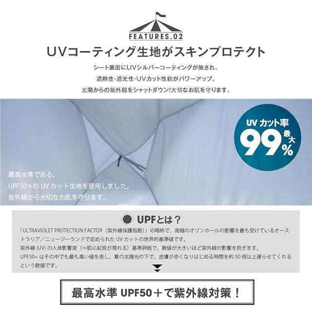 【オックスフォード織 / 耐久性、耐熱性、防水性、UVカット】テントシート素材はポリエスレルのオックスフォード織。柔らかい手触りと強度があります。オックスフォード織は気孔が多く、厚地ですが通気性に富んでいて夏場には最適です。さらにシート裏面にはUVシルバーコーティングが施され、遮熱性、遮光性に優れ、UVカットは世界基準UPF50+の最大99%カット値を認証されています。また、耐水圧2,000㎜の高い防水性があり、荒天に配慮された安心なテントです。