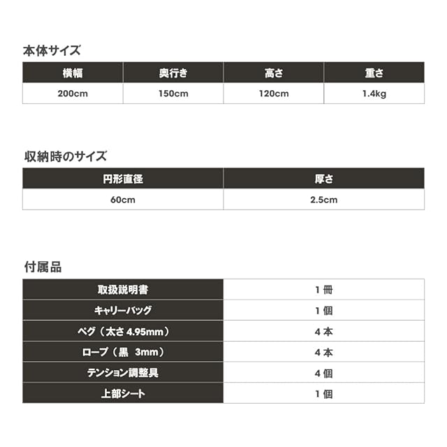 商品内容:W200×H120×D150㎝ 収納時 約Ø60×t2.5㎝
