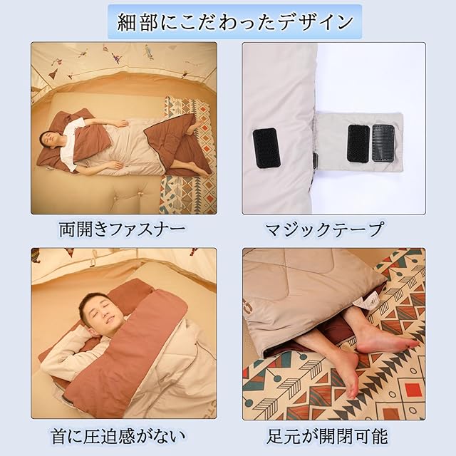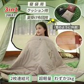 この寝袋は、暑い時期には敷き布団やブランケットとして、春夏秋冬には一般的な寝袋として使えます。<br>収納時にはクッションとして利用でき、コンパクトに畳んで持ち運びが容易です。<br>首の開放的なデザインで、より快適さが実現できました。<br>保温性と通気性に優れ、二つ重ねることで大きな二人用寝袋としても利用可能です。<br>ファスナーは全開から全閉まで自在に操作でき、温度調整も簡単です。<br>洗濯機で丸洗い可能、汗をかいても、汚れがついてもご家庭の洗濯機で丸洗いができるので、いつも清潔に保管できます。