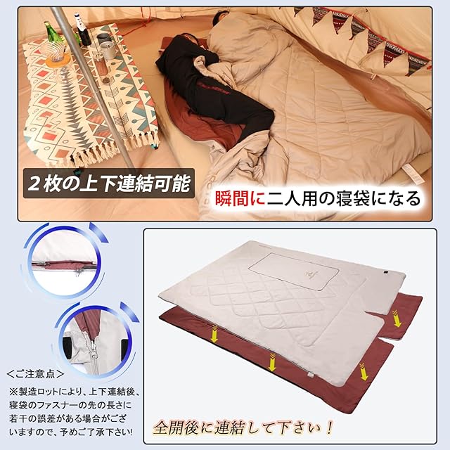 【連結可能】同じ寝袋同士をファスナーで連結すれば、広々とした二人用寝袋に。家族やパートナーとの使用にぴったりです。