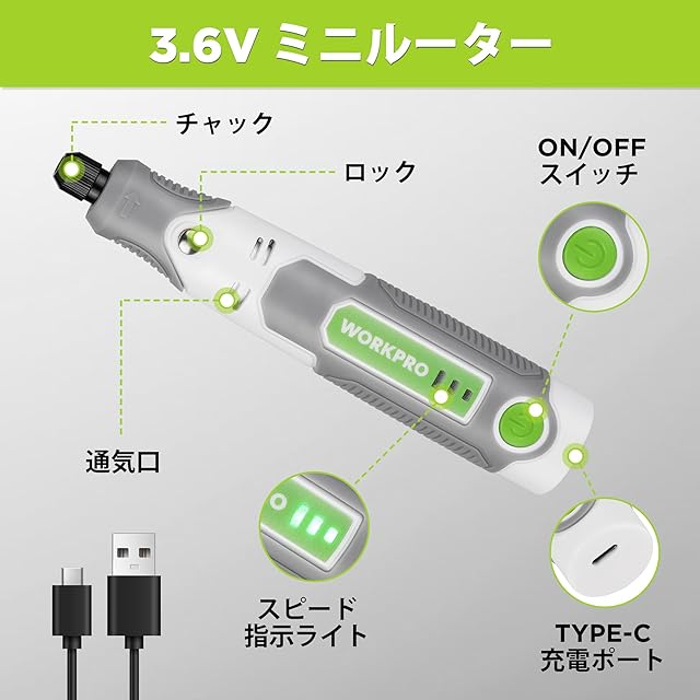 商品名:WORKPRO ミニルーター リューター 3.6V 69点組 17000RPM高速回転 3段変速 TYPE-C充電式 コードレス コンパクト 軽量 彫刻/穴あけ/研磨/切断/切削/つや出し/マニキュア/汚れ落とし 軽作業に向け ホワイト 日本語取扱説明書付き