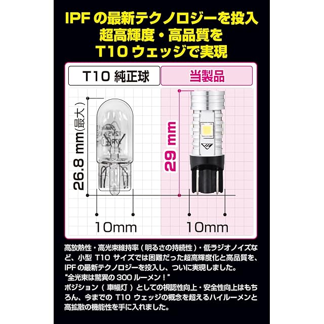 IPF ポジションランプ LED 車用 T10 300lm 6500K ホワイト 12V用 2本入 車検対応 ノイズ対策済 全方向照射 ハイルーメン 長時間変わらぬ明るさ 504W