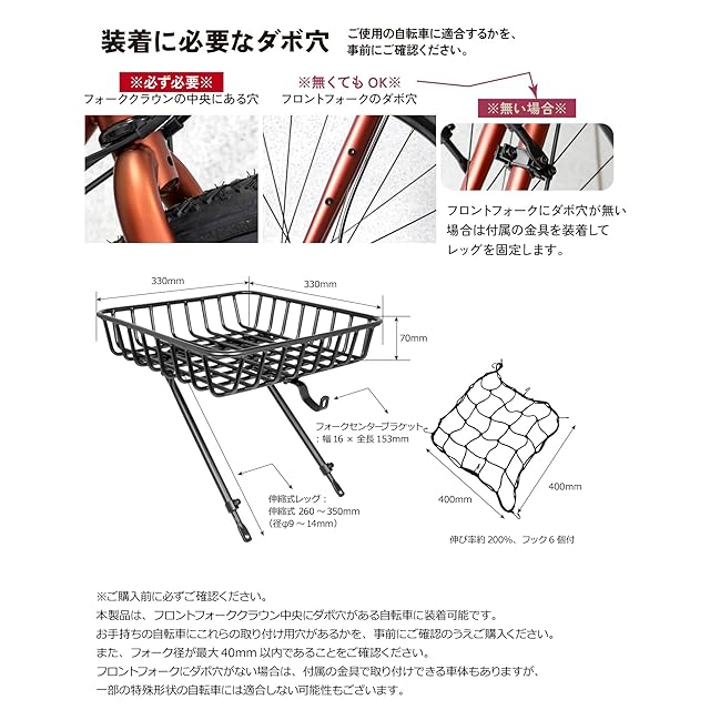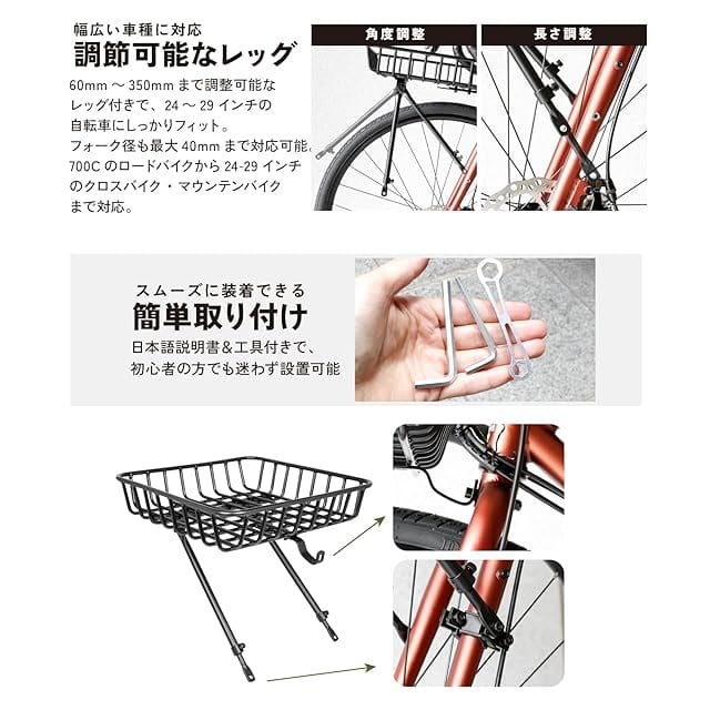 広々バスケットで、毎日の移動がもっと快適に 通勤・通学・お買い物など、日常のあらゆるシーンで大活躍! このGORIX製フロントバスケット(かご)は、高さ調整ができて700C・24~29インチ対応の自転車に取り付け可能な実用性抜群のバスケットです。 33×33cmの大容量サイズのかごで、通勤バッグやエコバッグ、買い物袋なども余裕で収納。 さらに、付属の伸縮ネット&フックで荷物のズレや落下をしっかり防止し、安全性も確保。 本体は頑丈なスチール製+防錆仕様で、最大荷重は10kgまで対応可能。 取付けは初心者でも安心の簡単設計。 フォーククラウンのダボ穴を使って固定でき、さらに付属の金具を使えば、フロントフォークにダボ穴がない自転車にも対応OK! 必要な工具と日本語説明書も付属しているので、初めての方でもスムーズに取り付けられます。