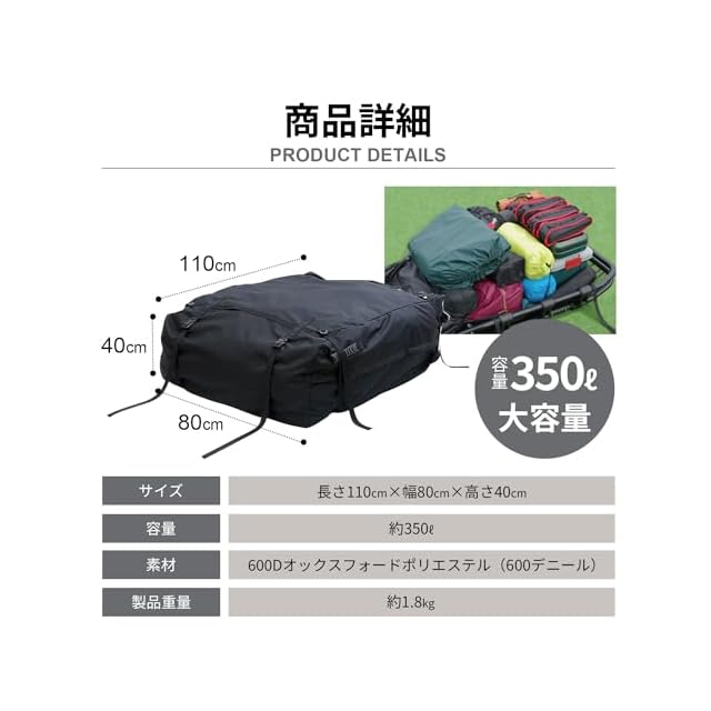商品名:テルッツォ(Terzo) Terzo ルーフラック オプション 350L ルーフラックバッグ ブラック 防水・防塵対応 ファスナーフラップ採用 固定用バックルベルト付 EA313