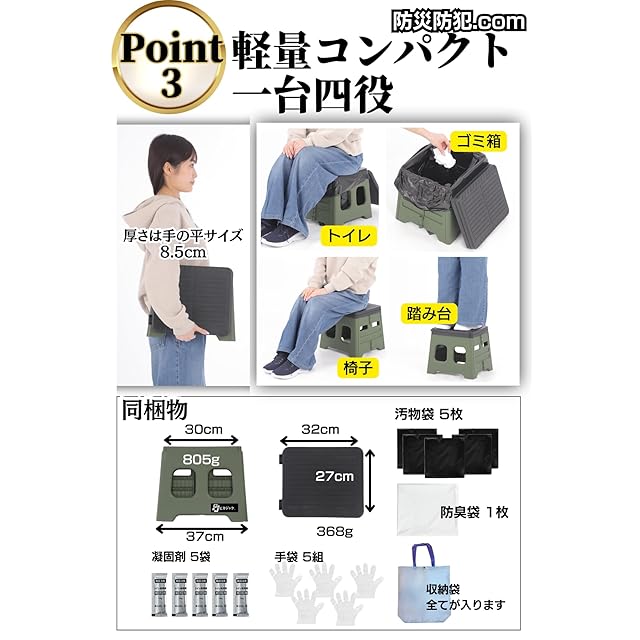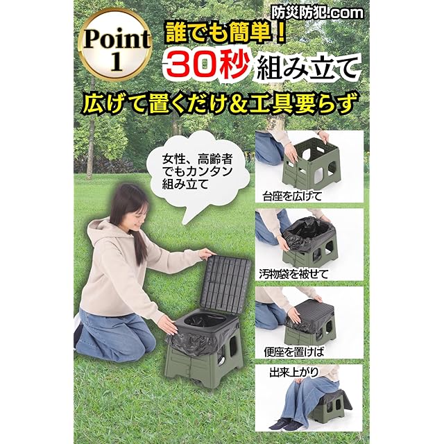 【設置カンタン&超軽量】 本体を広げ、汚物袋と便座を取り付けるだけの折り畳み式の簡易トイレです。10秒で設置・収納(収納袋付き)が可能です。重さ1.2kgで持ち運びカンタンなポータブルトイレ。【1台4役】 災害時や断水などの非常時は簡易トイレとして大活躍。平常時はイス・踏み台・ゴミ箱としてもご使用いただけます。【災害・アウトドア・渋滞時・介護】屋内だけでなく、屋外でも使用可能。災害・アウトドア・渋滞時・介護などトイレ問題の心配事を解決します。キャンプなどアウトドアやドライブなどでも大活躍。災害時、断水対策の非常用用トイレとしても最適です。