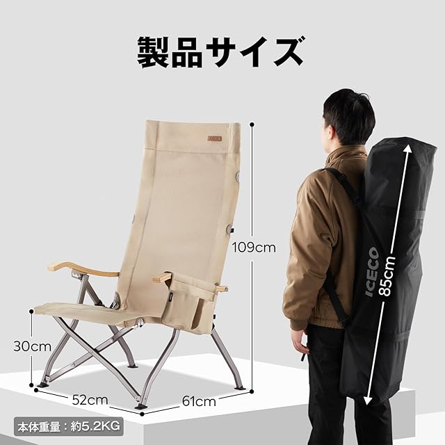 1600Dポリエステル、素材力満点!:ICECOは1600Dポリエステルを採用し、他社の600Dに比べて、アウトドアや室内の長期使用に適している。あつい季節も蒸し暑くなく、抜群の通気性と快適な座り心地を確保できます。座面の裏も防水加工し、雨でもタオルでちょっと拭くだけ座れます、雨に濡れてもカビにくい防カビ加工も施しています。通常のアウトドアチェアの座面幅は50cm前後、ICECOでは最大幅58cmのワイド設計を実現。体が大きい方でもゆったりとご使用いただけます。