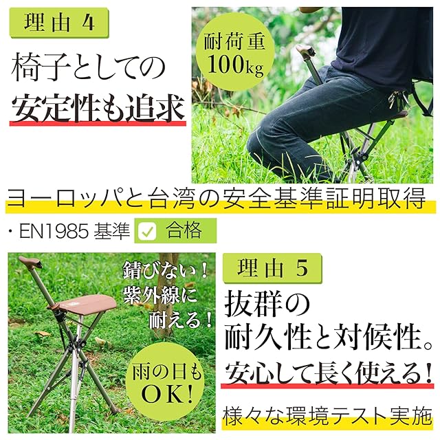 必要に応じてワンタッチで椅子に変身する歩行補助用の杖です。 日々のお散歩やハイキング、運動会の観覧、行列待ちの際の休憩等、様々な用途でご使用いただけます。