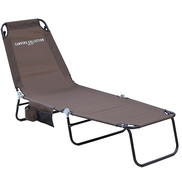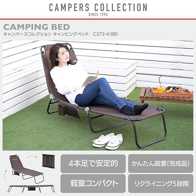 [キャンパーズコレクション 山善] アウトドアチェア リクライニング機能付き サイドポケット付き 幅55×奥行195×高さ24.5-86cm 折りたたみ リクライニング キャンピングベッド ブラウン C272-4(BR)