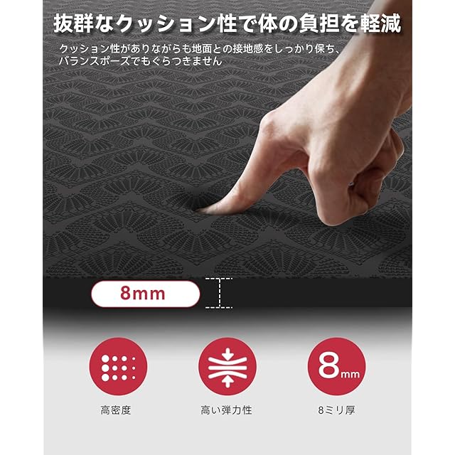 厚さ6mmのクッション性:6mmの厚さを持つピラティスマットで、膝や関節への負担を軽減。クッション性がありながらも地面との接地感をしっかり保ち、バランスポーズでもぐらつきません。