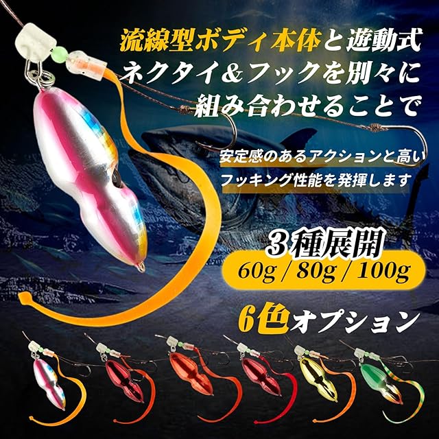 流線型ボディボディ本体と遊動式ネクタイ&フックを別々に組み合わせることで、安定感のあるアクションと高いフッキング性能を発揮します。<br /> マダイはもちろん、他に根魚やアジ、青物といった様々な魚種を狙い可能、誰でも使いやすい超万能の魚種限定解除ルアーです。<br /> ピーナッツのような流線型ヘッドは潮を受けてもアクションが安定、整流効果が高められており、潮流が早い時やドテラ流しの釣りでも快適に使うことができ、潮がキツイ時など底取りが難しい時により底取りができるようになる。<br /> ヘッド+フック+ネクタイがコンパクトになっているため魚がフックにかかりやすくフッキング率が上がります。<br /> 60g・80g・100g ウェイト3種展開、水深や潮の流れに合わせて使い分けてください。<br />