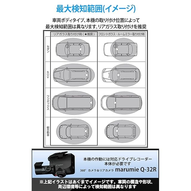 リアカメラ下側もしくは横側への設置を推奨。フロントガラスにも設置できますが、車両ボディタイプにより検知エリアが狭まる可能性があります。