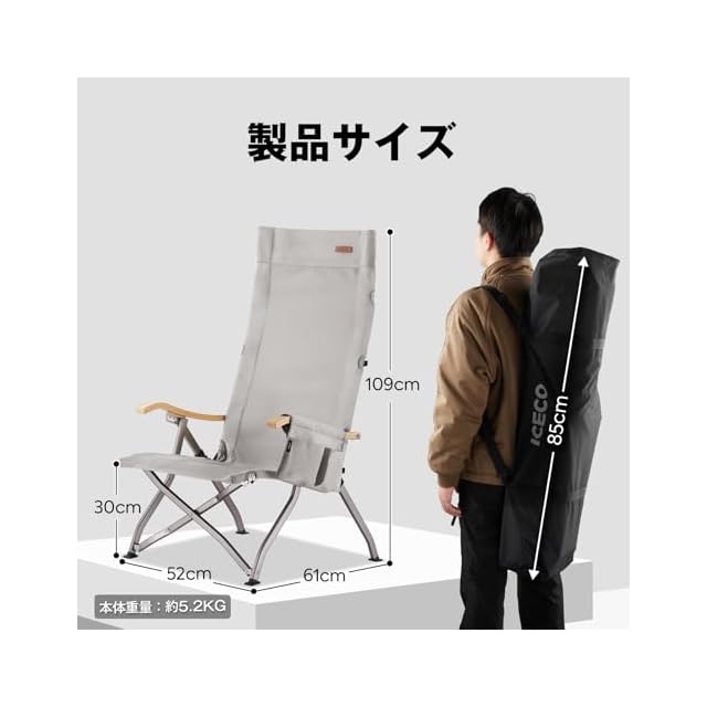1600Dポリエステル、素材力満点!:ICECOは1600Dポリエステルを採用し、他社の600Dに比べて、アウトドアや室内の長期使用に適している。あつい季節も蒸し暑くなく、抜群の通気性と快適な座り心地を確保できます。座面の裏も防水加工し、雨でもタオルでちょっと拭くだけ座れます、雨に濡れてもカビにくい防カビ加工も施しています。通常のアウトドアチェアの座面幅は50cm前後、ICECOでは最大幅58cmのワイド設計を実現。体が大きい方でもゆったりとご使用いただけます。