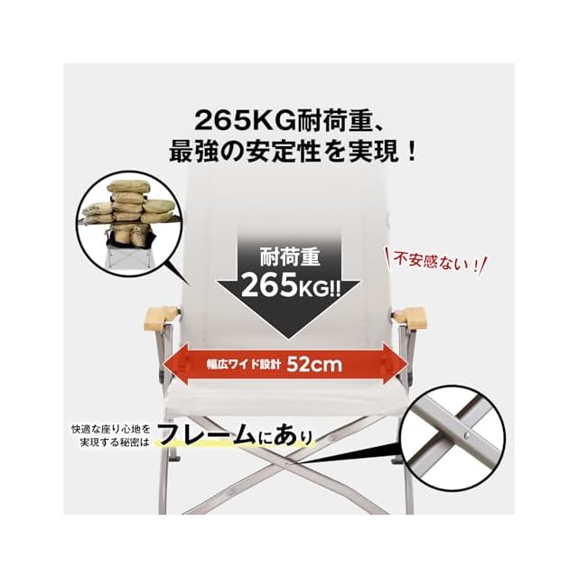 265KG耐荷重、最強の安定性を実現!:アウトドア椅子は1600Dポリエステル、A7075アルミ合金フレームを採用した設計で、265KGまでの耐荷重!さらに、座面を深くするし、ハンモックのように体にフィットし、ゆったりと包み込まれる最強の安定性を実現したアウトドアチェアです。