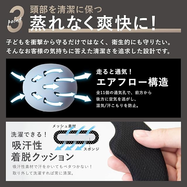 【 全方位保護クッションと付替えクッション】内部には厚みのある柔らかいクッションが配置され、前頭部、後頭部、側頭部、頭頂部 を全方位から保護します。クッションは取り外して洗濯可能で、更に前頭部と後頭部用の付替えクッションも付属しており、衛生面をサポートします。