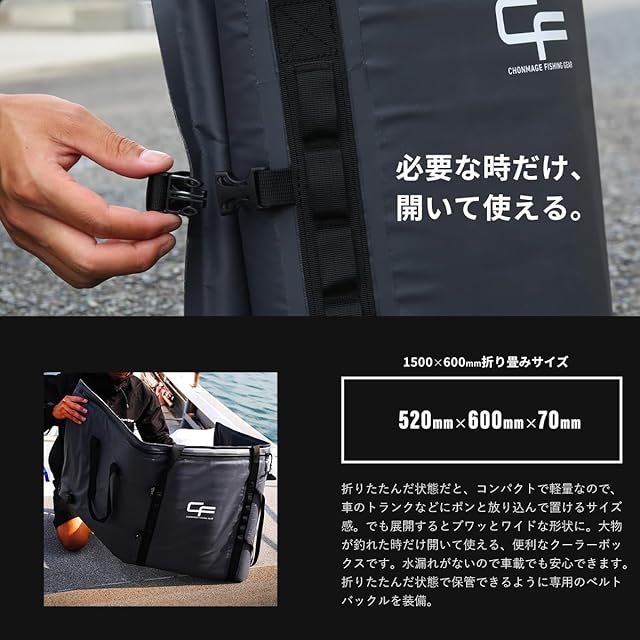 【これからの釣りのマストアイテム】 大物が釣れれば大活躍の大型クーラーボックスも、帰港して魚を入れるまでは一番場所をとる荷物・・・。万が一釣れなかった時にはなおさら。車内を整理してシートを下げて重くて大きなクーラーを積み込んでも、毎回の釣行で確実に釣果が上がるわけではありません。CFフィッシングソフトクーラーは”釣れるまで”は小さく折りたたんでおけるウェアラブル性能と、”釣れたら”抜群の断熱・保冷力と防水性能を兼ね備えた新世代フィッシングクーラーです。