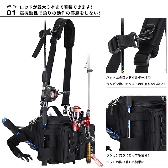 【最新版フィット感・固定感UPの釣り バッグ】釣り ウエストバッグを身に着けた状態で「ズレ落ちにくく」フィット感・固定感が弊社は重視設計としました。ウエストベルトの端末には蒸れに強いメッシュパッド仕様に従来品より幅広いウエストベルト(5cm)ですっきりとした、腰にしっかりとフィットして、ブレない釣り ヒップバッグ。5WAY式、フィッシングバッグ・ショルダーバッグ ・ ウエストバッグ ・ ハンドバッグ ・ メッセンジャーバッグ としてもおすすめです。ロッドベルト2点とカラビナ5点付きで最大3点のロッドを固定でき,タモ網も簡易ロッドホルダーを利用可能です。