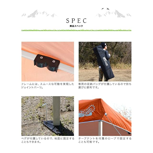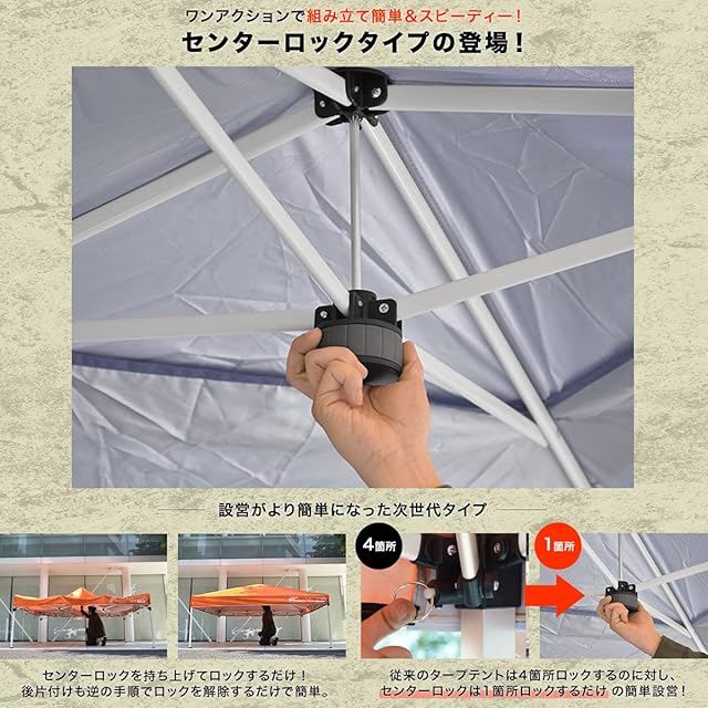 【ワンアクションで組み立て簡単&スピーディー!】<br> 初心者や女性にも簡単に組み立てができる、待望のセンターロックタイプが仲間入り。<br> タープを広げて中心のロックを持ち上げるだけでスピーディーに設営できます。<br> <br> 【強度・安定性に優れたタープテント】<br> フレームは強度・耐久性あるスチール製。<br> スチール製はアルミ製に比べて重量はありますが、安定性ある強度で、しっかりと設置が可能。<br> コンディションが悪い場所でも安心です。<br> <br> 【アウトドアやレジャー以外にも用途はたくさん】<br> 持ち運びしやすく、簡単に設営ができるので、アウトドアはもちろん様々なシーンでオススメ!<br> 気軽に使用できるので日よけ対策にGOOD!<br> <br> 【風抜けのベンチレーション機能】<br> トップカバー上部にベンチレーションを設置。<br> ベンチレーションから風が抜けることで風による転倒などに効果的です。<br> <br> 【優れたUVカット&高耐水加工】<br> 生地に施されているシルバーコーティングは、紫外線を防ぎ、UV遮蔽率は98%以上。<br> さらに高耐水加工で耐水圧は2,000mm以上!<br> 縫い目からの雨漏れを防ぐシーム加工付き。<br> <br> 【幅広いシーンで使えるタープテント】<br> 本体の脚を伸ばさず低い位置で使用することで、ビーチやピクニックなどレジャーの日よけに最適。<br> また子供用のビニールプールと一緒に使うことで、強い日差しから子供を守ることができます。<br> <br> 【4面全てに隙間なく設置可能!】<br> トップカバー裾のファスナーはサイドシート装着用。<br> 簡単に装着可能なサイドシートは、枚数や張り方で色々なアレンジができます。<br> 用途や環境に合わせて使用できるアイテムです。