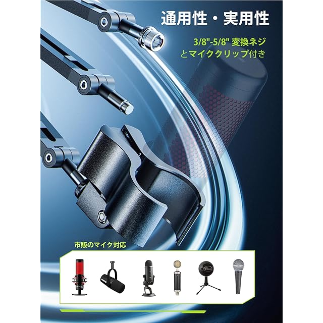 【多種多様なマイク通用可能】 M05マイクスタンド本体には1/4"ネジであり、3/8"-5/8"インチの変換ネジとマイククリップが付属しており、ダイナミックマイクやコンデンサーマイクなど、さまざまなマイクに対応しています。 マイククリップの直径は3~5cmで、対応するマイク径が広く、サイズに合うマイクを差し込んで取り付けできます。