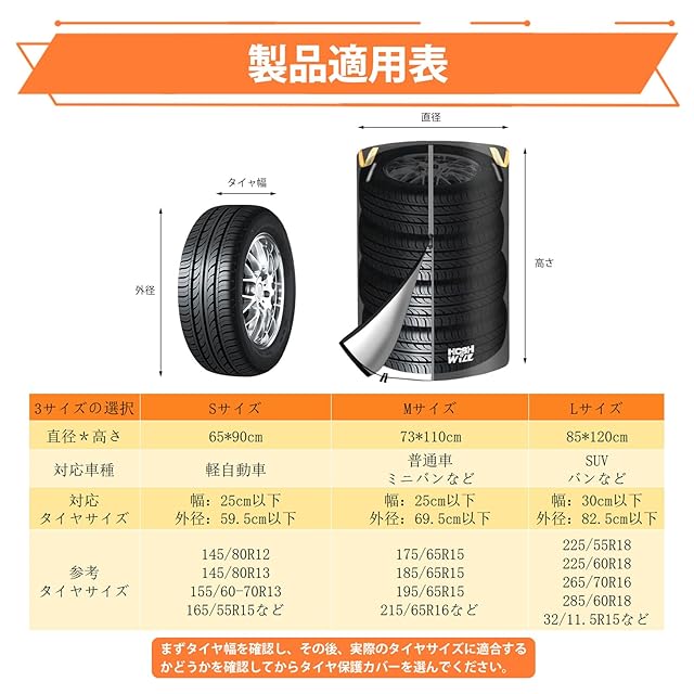 【製品仕様】 私たちのタイヤカバーは、さまざまなタイプとサイズのタイヤに対応するために、3つの異なるサイズをデザインしました。S:直径65×高さ90センチ、M:直径73×高さ110センチ、L:直径85×高さ120センチ。これらはそれぞれ外径63/72/83センチ以下のタイヤに適しており、最大4本のタイヤを収納でき、完璧にフィットします。購入の際は、事前にタイヤのサイズを測定してください。乗用車、SUV、トラックを問わず、理想的な保護を提供し、さまざまなニーズに応えます。