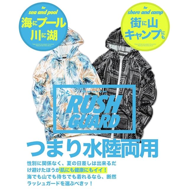 【商品説明】ラッシュガードの季節到来!通常のラッシュガードよりもさらにファッション性を高くしたパーカータイプです。水に濡れてもサラッとして通気性が良く、それでいて速乾性ですぐに乾いてくれます。ユニセックスで着用可能なので、ペアルックにもオススメ。海やプールへ行くのが待ち遠しくなるようなラッシュガードに仕上がっています。