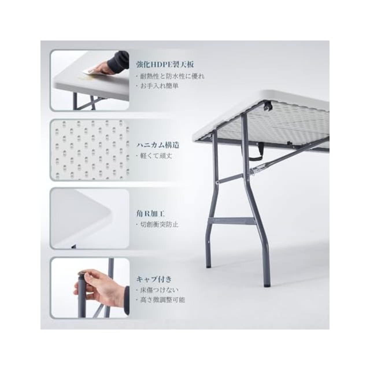 天板は強化プラスチック製で、丈夫で軽く、お手入れも簡単です。防汚機能もしっかり!持ち運びに便利な持ち手付。折り畳み式のデザイン、使用していないときでも持ち運びやクローゼットに簡単に保管できます。アウトドアにも最適で、折りたためば車の後部座席やトランクにも収納できます。1台有ると便利な折りたたみ式の作業テーブル! 日曜大工や園芸の作業台に!農作業や内職の作業台に!キャンプやバーベキューのアウトドアテーブルに!お好みや用途に合わせて使い分けることができる嬉しい仕様♪キャンプ、バーベキュー、お花見などにとても便利!