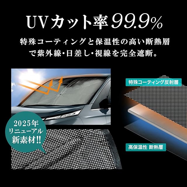 【99.9%以上UVカット・遮光断熱】夏には紫外線を防ぎ、車内の温度を下げることを目指します。フロントサンシェードにより、紫外線に対するバリアを作ります。約99.9%以上の紫外線を効果的に遮断してくれます。