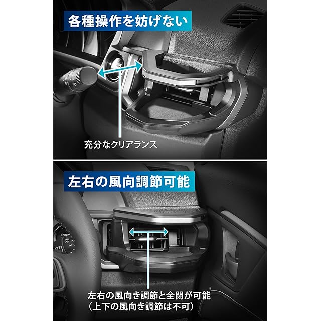 エアコンの風向き(左右)が調節できるエアコンフィンの操作ノブを操作できるようにドリンクホルダー背面の形状を専用のデザインにし、ノブの操作を妨げない取付構造にしているのでエアコンフィンの向きを左右に調節できるようにしています。また、エアコンの風によってドリンクを保温したり保冷したりすることができます。