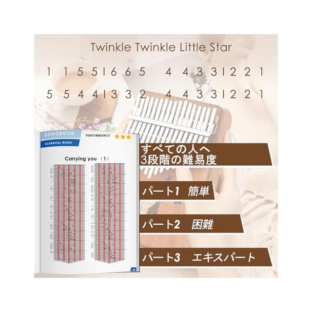♪学習が簡単:専門的に作成されたカリンバ学習小冊子を使用すると、カリンバの使用方法と演奏方法が詳しく紹介されており、学習が簡単になります。 カリンバのキーの歯には音符が刻まれています。 初心者でも音の位置や音階を把握できる音符シールも付属しています。 音楽の基礎がなくても、親指を動かすだけで素晴らしい音楽が得られ、一日中楽しめます