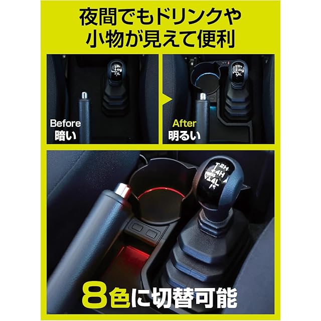 ドリンクホルダーとトレイの内底に間接照明を装備しているので暗い車内でもドリンクや小物の出し入れに便利です。