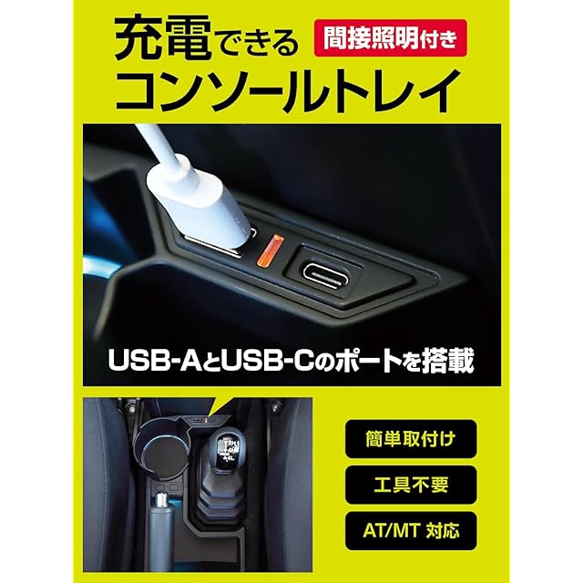 φ72mmまでの飲み物が入るドリンクホルダー、小物を置けるトレイ、スマホなどを充電できるUSBポートを備えています。