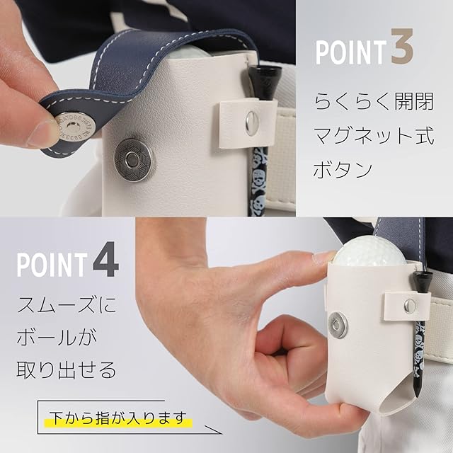 ・ベルトループ、カラビナ2WAY !ベルトに通してしっかり固定すればスイングする時も全く気になりません。カラビナで気軽に引っ掛けて使用することもできるゴルフボールケースです。