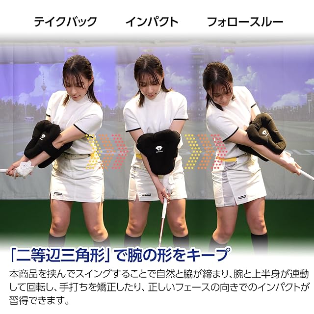 空気で膨らませた後に腕に装着して挟むだけで、スイングに大事な腕の三角形を自然と矯正したままスイングできます。