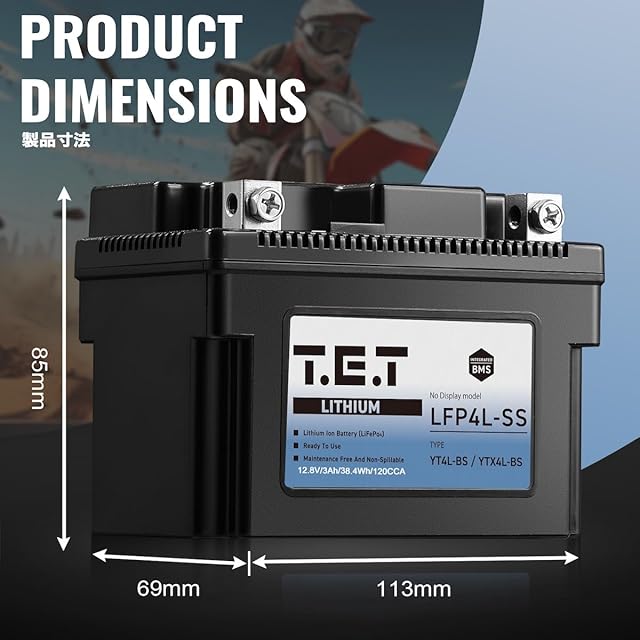 【超軽量・高性能】<BR> 従来の鉛バッテリーに比べて約1/3の軽さで車両の軽量化に貢献し、走行性能や燃費の向上を実現。さらに、約1.5倍の強力な始動性能と優れた低温始動性能で、大型車両や寒冷地でも安心です。<BR> <BR> 【長寿命・メンテナンス性】<BR> 鉛バッテリーの1.5倍以上のサイクル寿命で経済的。低い自己放電率により長期間保管が可能で、こまめな充電が不要なためメンテナンスも簡単です。<BR> <BR> 【安全性・利便性】<BR> 鉛バッテリーに比べ液漏れの心配がない設計で横倒し使用も可能。BMS機能やLiFePO4電池の採用により、衝撃に強く高い安全性と耐久性を実現しています。<BR> <BR> <BR> ■即使用可能 電圧測定ディスプレイ付き<BR> ■T.E.T エントリーモデル CCA120<BR> <BR> T.E.Tリチウムイオンバッテリーで、走りに革新を。<BR> 高品質・高出力。しかも手頃な価格で、あなたのバイクライフを進化させる。<BR> バイクの性能を引き出す、次世代リチウムイオンバッテリー。<BR> <BR> ■電圧:12V 3Ah 120CCA<BR> ■サイズ (約):横幅113mm / 奥行70mm / 高さ85mm<BR> ■重量 (約):0.6kg<BR> ■適合サイズ:YT4L-BS / YTX4L-BS / YTZ5V 専用<BR> <BR> ■メーカー期間:長期2年間(商品日より730日)<BR> ■バイク用 鉛充電器で充電可能!推奨アンペア0.8〜1.5A<BR> <BR> ■特徴<BR> 高品質なセル技術を採用し、電池容量・電圧ともに高性能を実現。<BR> さらに、さまざまな車種に対応する豊富なサイズラインナップをご用意。<BR> <BR> 「価格」と「品質」を両立し、コストパフォーマンスは業界トップクラス。<BR> バイクライフの新しいスタンダードとして、安心してお使いいただける製品です。<BR> <BR> 長寿命・軽量:従来の鉛バッテリーと比べて圧倒的に軽量、長寿命経済的かつパワフル。<BR> <BR> ぜひ一度、T.E.Tリチウムイオンバッテリーをお試しください!<BR>
