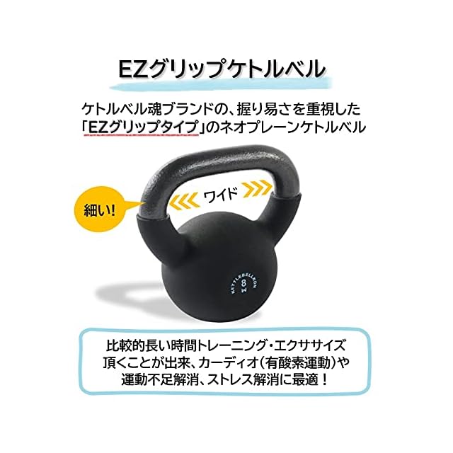 ・【握り易さを重視したグリップ設計】★従来のケトルベル(当社比)よりも、グリップ(ハンドル)が細く、またグリップ内側を若干広い設計としているため、握り易く、握力(前腕)への負荷を小さく抑えてトレーニング頂けます。(サイズの詳細は添付の写真をご確認下さい。)・【カーディオ(有酸素運動)に最適】★握力(前腕)への負荷が小さいため、従来のケトルべル(当社比)よりも、比較的長い時間トレーニング・エクササイズ頂くことが出来、カーディオ(有酸素運動)や運動不足解消、ストレス解消に最適です。・【ご家庭での利用に最適】★細いグリップ仕様のため、しっかりと握ることが出来、ハンドルから手が離れるリスクが軽減されます。★ソフトなネオプレーン素材で、床への傷や衝撃も少なく、家庭内での使用でも安心してご利用頂けます。★一般のビニールカバーと比較し、柔らかく、ベタつきや臭いも少ないネオプレーン素材のため、長期に渡って安心してご利用いただけます。・【豊富な重量バリエーション】★4kg 6kg 8kg 10kg 12kg 14kg 16kg 18kg 20kg 24kg 28kg 32kgを取り揃えています。★モニターの発色の具合によって実際のものと色が異なる場合がございます。製造ロットにより、商品本体やロゴの色あいが異なる場合がありますこと、予めご了承の程よろしくお願いいたします。・※製法上の都合上、製造過程において、ボディ部分のコーティング(ネオプレーン)上の小さい穴、ロゴのプリントの若干の乱れ、ハンドル(グリップ)部分の研磨跡や軽微なザラツキ等が発生しうることを予めご了承の程お願いいたします。